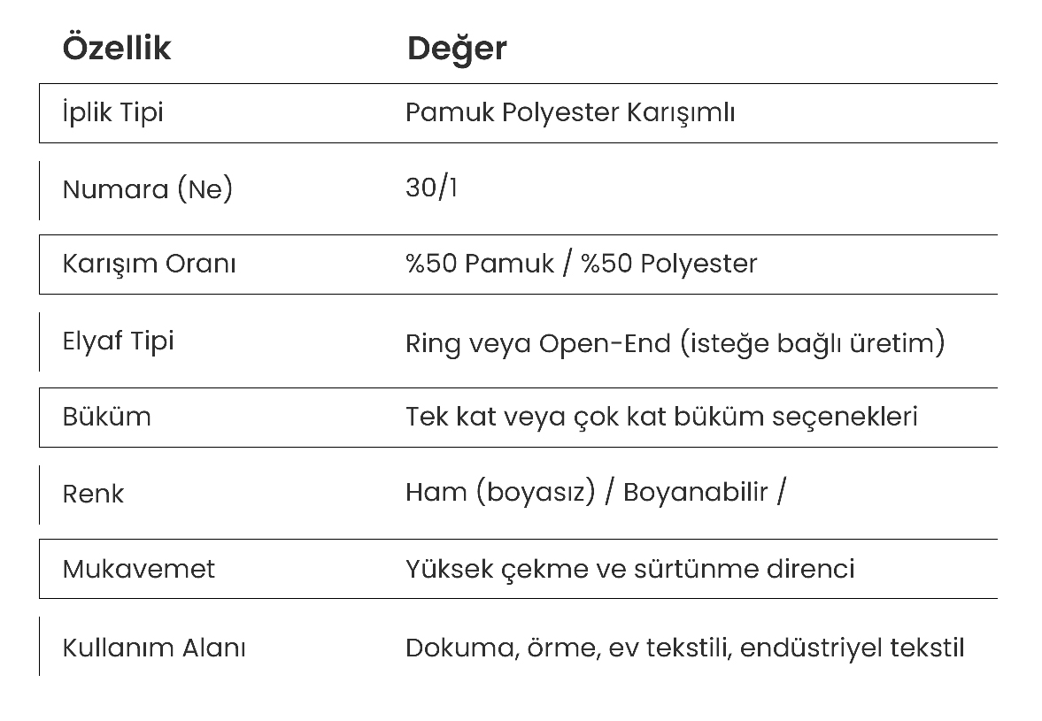NE 30/1 inceliğinde, %50 pamuk ve %50 polyester oranında üretilen bu iplik; hem doğallık hem de uzun ömürlü kullanım gerektiren tekstil uygulamalarında mükemmel bir denge sunar.